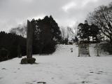 増山城から移動して、登城しました。展望台に向かう迂回路を経由して登城しましたが降雪がひどく、ノ−マルタイヤでは危険を感じました。登城後は道路が真っ白でスリップの警告灯が点きまくりの状況で下り道を恐怖を感じつつ、走行しました。あと30分、帰りが遅かったら車のタイヤがスタックして山の上に取り残されるところでした。 |