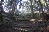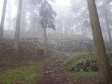 | 八城目 金沢城見学のあと、金沢駅に向かい、12:28の七尾行きに乗車。 13:57に七尾ついて飛び乗るようにまりん号(バス)で七尾城史資料館へ。 小雨が降っていたので、本丸に行くのを迷ったのですが、資料館の人に進められて登城しました。 登っている間が雨が止んでいたので、助かりました。 一通り回って16:13のまりん号に丁度間に合う時間でした。 七尾城は掘り切りもしっかり階段が作られており、安心して登れます。 |