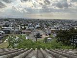 雨の中登城急な階段を登って天守へ 四方の見晴らしは、すばらしい 石の瓦や鯱鉾は珍しいと思う |