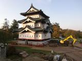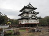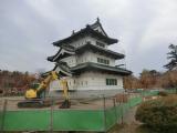 登城81城目。弘前城の敷地の広さに驚かされました。 皇居の半分の広さだそうです。 平成の曳家は着々と進んでいました。 |