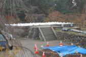 | 石垣の修復中でした。 移動に線路を敷設している様子が見れます。 |