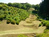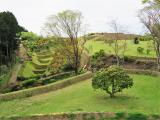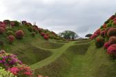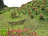 | 三島駅9時45分発山中行きに乗車、10時15分ごろ山中城跡に到着した。 西櫓を取り巻く障子堀、岱崎出丸の畝堀に感動した。 綺麗に整備されており、うす緑みどりの芝生とツツジの鮮やかな赤が綺麗だった。 ここで多くの人が戦いで命を落としたとは思えない、平和な公園という感じでした。 たぶん築城した当時は周囲の木々は伐採されて、見晴らしがよかったであろう。 また芝生もツツジも植栽されてなく、茶色の地面がむき出しで、歩きにくかったろう。 |