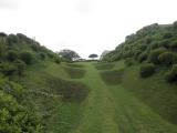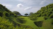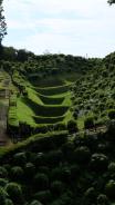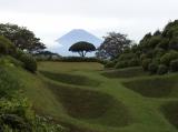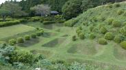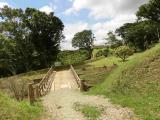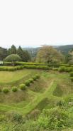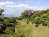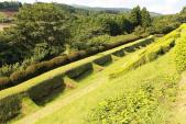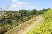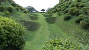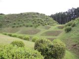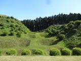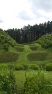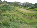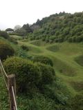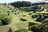 小田原城に続き本日2城目。JR三島駅からバスで山中城跡へ。途中バスの窓から三嶋大社が見えたが見学は時間的に無理なのでグッと我慢。山中城跡のバス停で降りたのだが、降りたのは自分と若い女性の2人だけ。どうも歴女のようだ。山城と若い女性、何だか不思議な組み合わせだ。見どころの一つである障子堀りを楽しみにやってきたが、期待を裏切らない面白い形の堀だった。芝生も本当に美しい。売店の裏方向にも堀があったが、こちらも独特の形で思わずニンマリ。遠かったけど来て本当によかった…。 |