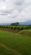 天気は小雨。三島駅の観光案内所では雨降りなのであまりお勧めではないと言われたが強行した。三島駅より往復乗車券を購入しバスで向かう。途中で乗客は残らず降りてしまう。山中城跡のバス停で運転手だけになったバスを見送った時には雨はやみ、傘をささずに歩くことができた。城跡をくまなく散策するには最低1.5〜2時間はかかるので帰りのバスの時間も確認ておいた方が良い。約400年前の山中城はローム層が露出し植栽はなかったが、現在は芝生を張って整備してあるので、芝生の緑がきれいだがゴルフ場の様だった。特に見どころは障子堀の西の丸でここからの夏の富士山の眺めも良かった。山中城跡売店の表にスタンプが下がっておりこれを押印。なおバスの元箱根行と三島駅行では山中城跡のバス停の位置が離れている。 |