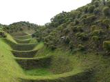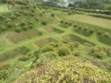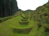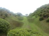 | 北条氏ゆかりの独特の堀を持つ、山中城へ。 前夜の三島での桜海老の釜飯をパワーにして、車にて向かう。 少し離れた駐車場(もう少し登ると売店や公園入口にも駐車場がありました)から出ると、そこは旧東海道の石畳道が数百メートルにわたって復元されており、昔の旅人の気持ちを暫し回想。 綺麗に整備されている気持ちのいい公園デスねぇ。 特にツツジの季節はよろしいのではないでしょうか? 富士山は見えませんでしたが、やはり障子堀や畝堀が見事でした。 一回りできるので、絶好の散歩場所かもしれません。 が、トイレに『ここで犬を洗わないでください』と貼紙がしてあり、色んな事をやる人がいるもんだなぁと俗世に戻りました。 |