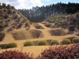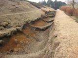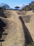 | 東海道四城巡り弾丸ツーリングの途中、山中城に登城しました。スタンプはR1沿い山中城跡売店に無造作に置いてあり勝手にゲット、その後土塁と空堀につくられた土づくりの城の一部を散策しました。単列型、複列型の障子堀があちらこちらにあり、延々と並んでいるさまは、高石垣とは異なる雄大さと技術の粋を感じます。 |