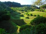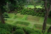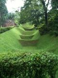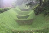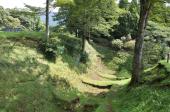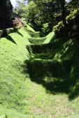 | 駿府城祉からの移動で山中城址へ。 車を駐車後、付近の箱根旧街道を散策。この再現道は結構雰囲気があって往時が連想できます。※雨上がりでしたので石畳が滑ります。注意 ちょっとした山道でしたが、「障子堀」には感動します。散策道のあちこちに「障子堀」がありますので、土塁を上って覗きこむと一望できます。 散策道は整備されているのですが、雨降り時の登城はすべりますので注意が必要です。 |