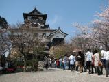 | 岐阜城から犬山城に移動する。国道157号から国道21号バイパスで各務原を過ぎて県道27号を右折犬山城の標識に従い駐車場に入れる。50mほど戻ると大きな石に国宝犬山城と刻印されている。 坂道を5分ほど登り入場券500円購入してから犬山城の入口門の2階でスタンプ押印する。天守への急階段は縁が丸みを帯び何万人もの入場者の重みに耐えているようだ。天守からは木曽川が眼下に見えて国宝の眺めが心地よい。全体的にしっとりとしたお城だ。文化資料館やからくり館は次の岩村城の時間が押しているので割愛した。 |