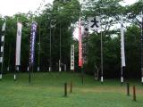 | のぼりまつりの最中だったのでたくさんの幟が立っていました。5日のイベントの準備だと思うのですが、駐車場に入れなくて困りました。普段は完備された駐車場に入れます。 |