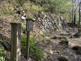 | 鎌刃城から車で向かいました。スタンプ設置場所の小谷城戦国歴史資料館前の広い駐車場に停めて、そのわきの追手道入口から徒歩で登ります。獣防ぎの金網の鍵を開けて入っていきます。思っていた以上にきつい登りです。特に石ころが多くて注意しないと足をひねりそうです。500mほど歩いたところに望笙峠という展望所があり、ここで一息つけたのは有難かった。そこから400m進むと番所跡。ここからは楽な道のりになってきます。御茶屋、御馬屋、首据石、黒鉄御門と続き、最も広い曲輪の大広間へと至ります。追手道ではほとんど人には出会いませんでしたが、このあたりでは多くの観光客と行き交います。おそらく番所跡近くの駐車場まで車で登った方々でしょう。 さて、遺構はとても素敵なものばかりですが、特に本丸と中丸との間の大堀切は大変規模が大きくて感動しました。そしてどの曲輪にも野面積みの石垣が組み込まれています。関東の北条氏の城址ばかり巡ってきた身としては、こんな山の上にこんな石垣を組んでいることに驚きを隠せません。やはり戦国期は西のほうが強いし、進んでいたのを実感しました。 |