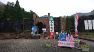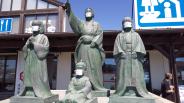 | 40城目 10時ごろ、麓の駐車場に着いて10:45発のガイド付きのシャトルバスに乗りました。 直後に着いた人は11:30発を案内されていたので、ラッキーだったのかな。 近くの道の駅で、お市さまと三姉妹がマスクをして遠くを見つめていました。 |