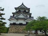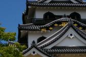 | 12天守の一つ、井伊大老のお城。 天守閣直下の広場で「ひこにゃん」の静かな演技に思わずクスクス しかしお城の破風が多く金張り化粧されていて、美しい城という印象 天守からの眺望も小山の上の天守故見晴らしも抜群。 |