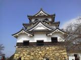 | 中部バスツァー5城の1城目。濠、石垣、門が現代の風景の中にとけ込んでいる。天守は白と黒の彩りよく、黒の線がやや太いので重厚感を増している。大きくはないがまとまっている城だ。桜が満開、彦にゃんが人気だった。 |