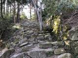 | 安土城から徒歩で30分ほど。田んぼの道から文芸の里という施設の敷地を通り抜けて車道へ。「桑實寺」という看板に従い車道の坂道を登って行ったら石段の途中に出ました。 ここから寺の境内まではひたすら石段の登りで、さすがにキツイ…。途中の山門では通る時にセンサーが鳴って、ここのコメントで知っていたもののドキっとしました。 本堂につくと拝観料300円のお支払い。石段の登り口から本丸まで10丁あって、この本堂で4丁目とのこと。この先も石段が続き、結構急坂で普通に登山です。8丁目を過ぎたあたりから土の道になり、9丁目から平らな道になって、10丁目で本丸。本堂からは20分くらいなので登山と思えば短くて楽ですが…。 本丸の入口には門の跡のような石垣が。本丸を突っ切り、向こう側の急な石段を下って平井丸、池田丸と進みました。意外にも立派な石垣が残っていて、石垣の囲いを見ていくと生活の跡がうかがえる感じ。 池田丸から細い道を下ったところに狭いけどとても眺めのいい場所があって昼ご飯休憩。ここまでは踏み跡がはっきりしていたのに、この先にあるらしい大石垣への道がわからずに桑實寺へ引き返しました。 |