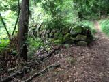 有料道路の開錠と同時8時30分に門を通過する。10分ほどで駐車場に着き登城開始。高低差のほとんどない砂利道を5〜6分歩を進めると、観音正寺にたどり着く。 途中には有難い格言が多く掲示されている。 下段の「池田丸」は一番大きい郭で虎口だけでも4つほど発見できた。郭を囲む石垣も当時の姿を残しており、圧巻である。 |
