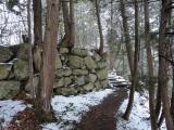 | 安土駅前のレンタサイクルを利用。観音正寺を目指す。しかし林道が冬季封鎖。 歩いて桑實寺方面から登る。石段はやはり足腰にこたえる。 意外にもスタンプは桑實寺にあり押させていただいた。入山料300円。「今年からスタンプがうちの寺にも配置されたんですよ」とのこと。 結局、遠くて観音正寺は断念。桑實寺の住職さんに感謝。 石垣は崩れているところがまた素晴らしい。 |