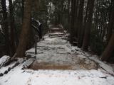 雪降り、かつ積雪のなか登城しました。多数の完全武装した金剛山登山軍団のかたわら、傘をさしてモックを履いて登る私らでした。売店の店員さんに「道はぐちゃぐちゃですからそれではでろでろになりますよ」と言われました。もちろん石段では尻もちをつきました。 |
