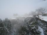 | 百名城巡りのきっかけとなった1城目。羽田から飛行機の乗り継ぎも初めての経験。伊丹から小さなプロペラ機(?)でコウノトリ空港へ向かう空から竹田城を見、竹田の駅裏から城へ登り、翌朝は事前に予約したタクシーで立雲峡へ向かい、雲海に浮かぶ城を見る。 早朝の街は濃い霧におおわれていた |