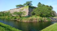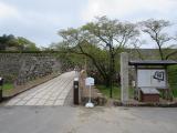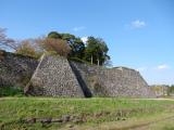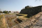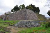| 60城目 レンタカーで明石城から向かいました。城の北側に駐車場があります。大書院はすぐ近くですが、見どころは南側の高石垣と、土塁で防御された南馬出だと思います。典型的な馬出が、はっきりそのまま残っているところは少ないのではないでしょうか。 馬出をその南側から堀越しに見てみたかったですけど、時間の関係で割愛でした。 写真は、南側から見た高石垣、南馬出しから見た土橋、南馬出しです。 |
