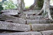 | 連立式天守閣、その天守台の石垣を一周回ることができました。通路は狭くて観光客は一人も入ってこないのでゆっくり見上げて鑑賞できました。近辺で採れる結晶片岩とのこと。赤や青、そして緑色片岩と色彩色に富み、石の帯状の層になった模様が芸術画のようで、いつまでも眺めてしまいました。 |