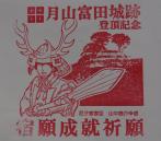 松江城に続いて登城です。スタンプは安来歴史資料館の入口右側にあります。付近の案内図ももらい受付の人に聞いてみると途中まで車で行けるとのことで、車で行きました。難攻不落の要塞を一気に登城しました。月山の頂上からみると城の大きさがよくわかります。登城記念のスタンプを押して下山しました。 |