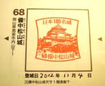 | 20城目。まだまだ先は長い。2度目の登城。前回は駅からてくてく歩きましたが、今回は城見橋公園まで車で行き、シャトルバスでふいご峠まで。700m歩くだけだったので、すごく楽に感じました。やはり素晴らしい天守です。スタンプは天守入口の受付に出してありました。 |