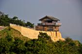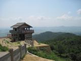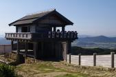 | ふもとから鬼城山ビジターセンターの駐車場までの3?は道幅が非常に狭く対向車が来ないかヒヤヒヤだった。駐車場は予想以上に車が多く家族連れやハイキング客が大勢いた。整備された遊歩道を歩いていくと4百m歩いていくと角楼と西門が目の前に現れてくる。城壁は2.8キロあり歩いて約一時間である。 |
