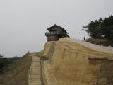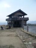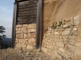 | 本日1城目。ビジターセンター迄車で行きウォーキングコースの「鬼ノ城コース」を散策しました。この日も強風と黄砂の為景色は良くありませんでしたが、断崖に積まれた石垣や復元された西門等見事な物でした。売店で物品を購入すると何故か名前をフルネーム聞かれました。 |