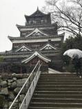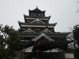 折からの大寒波のため広島駅でスタッドレスを装着したレンタカーを借りて、広島県5城攻略ツアーをスタート!まずは広島城に向かいました。車で広島城で行く場合に面倒なのが駐車場でしょう。広島城の周りには駐車場がありません。もっとも便利がいいのは広島市中央駐車場(地下駐車場)なので、この駐車場にナビを設定していくことをお勧めします。駐車場の1番出口から地上に出て、天守閣まで歩きました。広島城はさすがに中国地方の覇者毛利氏の居城にふさわしい規模で、広大な縄張りに天守や櫓が見事に復元されています。スタンプは天守閣のミュージアムショップに行き、備え付けのベルを押すと、右手から職員の方が出てきて、スタンプを出してくれます。職員の方も慣れたものでスタンプ帳を出すと「113ページの73番です」などと教えてくれました。天守閣の最上階まで登り、雪が舞い落ちる広島の街を眺めて、広島城を後にしました。 |