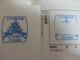 | 49城目です。 広島駅より市電で紙屋町西へ。そこから徒歩10分ほどで到着。スタンプは天守閣1Fの売店の方に声をかけて出してもらう。状態は良好。 吉田郡山城が手狭になったことから毛利輝元が新たに築城した広島城。天守閣は原爆によって倒壊していしまったので、現在の天守閣は復元天守です。しかし外観はよく復元できていると思います。 かつては70以上の櫓を擁し、威容を誇った広島城。今後も世界遺産の原爆ドームと共に広島のシンボルであり続けることを願う。 |