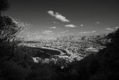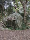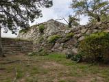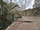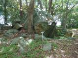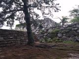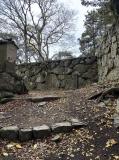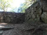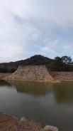 幅広の水堀越しに望む天守台跡の石垣の曲線がなんとも素晴らしく、色んな方角からじっくりと眺めて楽しんだ後、指月山頂上の詰丸に向かう。片道20分弱。虎口跡のほか、巨大な岩盤を利用した貯水槽や方形の貯水槽が残っている。至る所に矢穴のあいた巨石があったり、眺めも良かったりで、登る価値ありです。クマはいません。 |