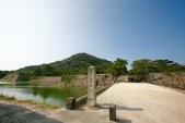 本丸門への入口となる、内堀にかかる石橋の手前から、天守閣跡が見えます。内堀に付き出し、扇の勾配の石垣が美しいです。「明倫館、遺構、万世橋」、の説明板の、明倫館は藩校であり、藩校であることを現した形の説明は興味を持てます。海辺につながる潮入門跡と白い銃眼土塀の景観もきれいでした。 |
