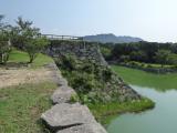 | 72登城 指月第一駐車場の無料駐車場に車を止めて、スタンプは本丸入り口で、料金はJAF割がきく、水堀と石垣が残っていて、指月公園として整備されている。この辺の地方のほとんど家の屋根にしゃちほこが付けられている、そして屋根の瓦の色が茶色である、不思議である! |