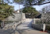 19城目。徳島駅を降りた途端、方向感覚を無くし、うろうろ。城跡は線路の反対側と分かったが、今度はJRの線路越えの橋が見つからず苦労。交番の前を約300m程行き、やっと越え、まず博物館受付でスタンプゲットし(入館せず)、表御殿庭園(50円)見学。その後、鷲の門を通り、黒門枡形を見て、屏風櫓跡、旗櫓跡、隅櫓跡の石垣の上をウォークし、石垣の緑色片岩をチェック。それから約200m奥の石段を上り、東二の丸跡(天守跡)、本丸跡へ。約330段の石段はさすがにきついが、本丸跡からの景色を楽しみ、満開の桜を見て一呼吸入れる。西二の丸、西三の丸を経て、再び隅櫓跡へ戻り、堀の外周を北・東・南と回り下城したが、城内は案内図が少なく分かりにくかった。 |