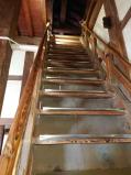 | スタンプ、御城印とも天守内入場券売場。天守まで急な坂をひたすら登る。真夏の登城は。。 さらに天守内の階段も急斜。 |
