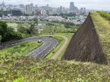 | 東北大学川内キャンパスで開催された学会の昼休みを利用、国際センター横の歩道を大手門跡に向かった。大手門跡から本丸跡への道路は車両通行止めである。昨年、一昨年と地震により、石垣が危険となり車両通行止めとなったらしい。しかし、歩行者は通行可能で、車の通らない道路を安心して登ることができる。 大手門跡から10分ほど急坂を歩くと、本丸直下の高石垣である。表面が平らな四角い切石をきれいにそろえ、整然と積み上げられている。また、算木積みの隅角が見せる傾斜のカーブも優美だ。 本丸跡入口まで来ると、道路には通行止めの柵。柵の向こうの道路には石垣が崩れ落ちている。東日本大震災で大きな被害を受け、修理が終わったところでまたもや地震の被害を受けるとは、残念なことだ。 本丸跡には御殿が建てられていたそうだ。ここには大広間の間取りが敷石を使って、展示されている。建物自体を復元するのは難しいのだろうか?秋晴れの下、本丸跡からの仙台市街の眺めは素晴らしい。高層ビルが多くなったようだ。観光ツアー付き添いのガイドさんの説明では牡鹿半島まで見通せるとのこと。地震で被害を受けた伊達政宗像も修復されていた。 |