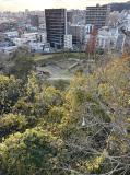 松山城から歩いて湯築城跡のある道後公園へ。徒歩で容易にはしごできる100名城はここと甲府くらいでしょうか。公園入口を入ってすぐの資料館でスタンプを押しました。史跡として整備している公園の南側を見た後、展望台になっている中央の丘陵に上がり、先ほどまでいた松山城などを眺めました。 |