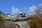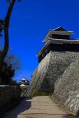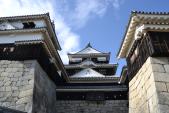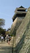 | 21棟の重要文化財をもつ松山城。ロープウエイで登城したのでは、つまらないので4コースある登城道のうち今回は、二ノ丸史跡庭園駐車場に駐車し、「黒門口登城道」から20〜30分かけて、本丸を目指します。当時の黒門周辺には、わずか100m程の間に3つの門等があり、堅固な構えだったそうです。途中にある中門(塩見門)跡には、往時の石畳がそのまま残っています。また、反り返った石垣も見ごたえがあります。 大手門跡、戸無門、筒井門へ、さらに太鼓門を抜けると本丸広場に到着。天守入口でスタンプを押印。天守等の見学後、外から「南隅櫓・十間廊下・北隅櫓」の見学をお勧めします。(愛媛県) |