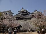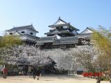 | ロープウェイに乗り搭城。桜が満開でロープウェイの景色も楽しめます。 大天守と小天守・南隅櫓・北隅櫓を3棟の渡櫓(廊下)で連結し、連立式天守となっています。築城は加藤嘉明で、キャラクターのよしあきクンがおもてなしをしていました。 嘉明は20才の時に賤ヶ岳の合戦において武功をあげ、七本槍の一人としても有名です。 加藤嘉明は25年をかけて松山城を作りましたが、1627年会津へ転封。その後は蒲生氏郷の孫忠知が出羽国から入国し二之丸の築造を完成しましたが、参勤交代の途中、在城7年目に京都で病没し、嗣子がいないので断絶。 その後、1635年桑名城主・松平定行が松山藩主となり、14代世襲して明治維新に至りました。 松山城は現存天守と桜が相まって、素晴らしいの一言に尽きます。 |