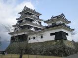 | 59城目 宇和島駅から松山方面の特急に乗り、約45分で伊予大洲駅に到着。 松山から宇和島へ向かう際も確認できましたが、車窓から大洲城の雄姿を堪能できます(同城は宇和島方面寄りに所在します)。 方角は理解できたものの、体調不良のため、往路はタクシーで向かいました(約5分、710円)。 復元天守と併せて、台所・高欄(こうらん)2つの櫓に立ち入ることができます(両櫓は江戸末期に再建された重要文化財)。 観覧料はクーポンを用いて、おとな500→450円。見学には靴を脱いでまわりますが、靴箱とともに荷物を収納できる無料ロッカーがありがたかったです。 発券所でスタンプを押したので、手ぶらで見学できました。 同城のビデオ解説(約5分)も鑑賞しましたが、肱川からの風が思いっきり入ってきて少々辛かったです。 復元天守内では同城築城時の様子を描いたジオラマがほほえましかったです。 きれいに整備され気持ちよく見学できる態勢を保たれているところに好感が持てました。 このあと肱川に出て、苧綿(おわた)櫓(重要文化財)方面へ向かいました。 ここからの眺めもよかったです。 ※13.3.1再訪 |