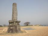 | 名護屋城に向かう途中に伊達政宗陣屋跡という交差点を見かけたため、 急遽引き返し、交差点付近を探索。 名護屋城は秀吉が朝鮮遠征の拠点となった城で名護屋城の周りには 当時のそうそうたる大名の陣屋があったため、その陣屋跡も多い。 さて、陣屋跡の立札はあるものの、民家の裏山のような場所に分け入り、 かろうじて石垣?を発見できたため、再び名護屋城博物館を目指す。 博物館でスタンプと名護屋城跡探索マップを頂き、探訪コースに従い城跡を見学。 時間と体力的なこともあり、お手軽コース(それでも1時間コース)を行く。 大手口→東出丸→三の丸→本丸→天守台→馬場→二の丸→搦手口の順に見学 あまりの石垣の量におなかいっぱいという感じ。 本丸の城祉碑は驚くほど巨大で、文字は東郷平八郎のものです。 お昼も過ぎたので、呼子のいかを食べに名護屋城をあとにする。 |