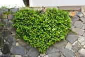 | ふと石垣を見ると、植物がハート型に茂っている。 後あと調べてみると、このサイトでは話題だった模様・・ 気付いてよかったが、城巡りは下調べをすべしと気付かされるのであった。 |