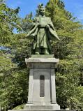 | 秋田の百名城・続百名城を一気に攻める旅、最後に訪れたのは久保田城。いわずと知れた久保田藩佐竹氏の居城、現在は千秋公園として整備。 脇本城、秋田城の登城に利用したレンタカーを秋田駅で返却、徒歩で黒門跡から二ノ丸に入り、佐竹史料館でスタンプを確保。歴代藩主の鎧や佐竹氏本陣の旗「旌旗」などを見て、長坂門跡、表門(復元)を経由して本丸へ。御隅櫓の閉館時間(16時半)に何とか間に合って最上階から夕刻を迎える秋田の街を一望。曇天ではあったものの遠くに脇本城を抱く男鹿半島や古代秋田城があった高清水公園あたりがよく見えて、一日の登城行を振り返り。本丸跡に鎮座する八幡秋田神社への参拝を経て、長岡安平による庭園としての千秋公園も楽しみながら、土塁を堪能できる帯曲輪門跡や胡月池を経て、中土橋門跡から公園の外へ。「支那そば 伊藤」に立ち寄ることができなかったのは残念だったが、のんびりと散策できて心身ともにリフレッシュ、夕食には「秋田比内地鶏や」にて「究極親子丼」(1,580円)で幸せな気分に。 写真は、この城の顔ともいえる表門と御隅櫓、そして本丸の中心に建つ12代藩主・佐竹義堯の像。 |