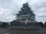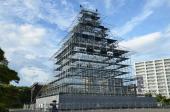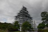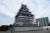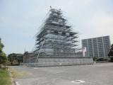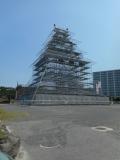 | 天守閣の造営が計画されているのか、お城の形をした組み立て櫓が建っていました。近くでは、三の丸の発掘調査が広範囲で行われていました。 |