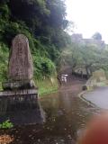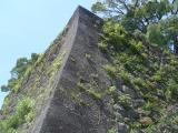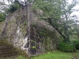 | 『81城目』 大分駅近くのホテルから車で約90分程度。大雨の中、ナビの案内した道が極端に狭くなるというトラブルがあったが、無事に9時前に到着(帰りは、違う道を利用したら広い道でした。)。カッパ&徴収所で借りた傘を利用し登城(スタンプは徴収所にて。印影は良好。)。雨の影響と早い時間ということもあり、ゆっくりと見れたのですが・・・晴れてたら、もっと景色がよかったんだろうな・・・ 個人的には、見事な石垣です。 |