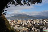 | 鹿児島中央駅前から市電に乗車、鹿児島城に向かった。市役所前で下車。城山方向に向かうと城門が見えてきた 御楼門の両側は高さが7,8メートルの石垣である。堀にはハスが立ち枯れてる。ここでは堀も石垣も防御の役割を果たさない。堀にかかる小さな石橋を渡ると、石垣よりはるかに高い御楼門である。1873年に焼失したものの、2020年に復元された。巨大な門柱が支える、この御楼門は日本最大の城門とのことだ。 門をくぐると、正面の石垣には大小さまざまな凹みが無数にある。西南戦争での砲弾や銃弾の痕とのことだ。鹿児島城は私学校とともに激戦の舞台となった。石段を登ると本丸跡であるが、城の遺構はあまり残っていない。 黎明館に入り、スタンプを押した。ここには、古代から現代にいたる鹿児島の歴史がわかる展示品、民俗資料などが展示されている。 鹿児島城は本来、背後の城山とふもとの居館が一体となった城だった。薩摩義士碑の横からきれいに舗装された、ゆるい?ロープの遊歩道を登った。20分ほどかけて城山展望台に到着。桜島、錦江湾、市街地が一望である。残念ながら、桜島の頂上付近には雲がかかっていたが、積雪もしていた。 |