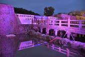 | 023/100名城目 志布志市埋蔵文化財センター(無料)の「志布志城」のジオラマは素晴らしかったですが、鹿児島城の黎明館(有料)には、さらにでかいサイズ(1/100)のジオラマがあります。同じ方の製作だそうです(すごい!)。こちらも撮影できます。 「御楼門」の復元完成予定は2020年月。もうちょい先ですね。ライトアップは、桜島に掛けてなのか、サクラ色でした。 |