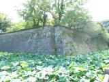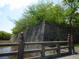 | 九州の名城を巡る旅第4日11番目。黎明館でスタンプをゲットし、外に出て石垣をチェック。銃弾の跡を確認する。堀端を少し歩いて古写真の当時の建物を想像する。 |