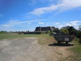 入城券には有名なペリー提督一行(奥地探検隊)が中城城跡の調査測量等を行った時のハイネのスケッチが印刷されていました この絵の場所は南の郭から西の郭に降りていく階段と正門付近のようです 階段の上側に当時は門が有った事もよくわかります 見学順路が裏門(北)から正門(南)に向かって歩くので方向感覚が狂いますが 裏門方向が勝連城側で正門方向が首里方向です 首里側からの攻撃を想定していて南の郭には 火矢(銃器)を仕掛けるための狭間が有りました 雨が上がり少し天気が回復したので城壁から勝連城を望むことができました 肉眼でも見えますが双眼鏡を持っていかれることをお勧めします 護佐丸の墓は入り口が少し分かりにくい所にありました この後は勝連城に行き逆方向から中城城を望みました 隅頭石は首里城だけではなく按司の屋敷にも有り中城城でも 観ることができました |