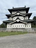 | 弘前城 2025年8月12日 | 前日弘前市内に宿泊。宿でレンタサイクルをもらい城に向かいました。やっと三河在住だととても遠い現存12天守に登城することができました。現在は石垣修理中のため仮の場所にありますが、資金不足で櫓が天守代用になっていて、表面だけ破風があるのも江戸時代の藩のリアルを感じる天守です。城郭はほとんど木に覆われていてたしかにこれは桜の時期は名所になりそうだなと感じるところです。 |